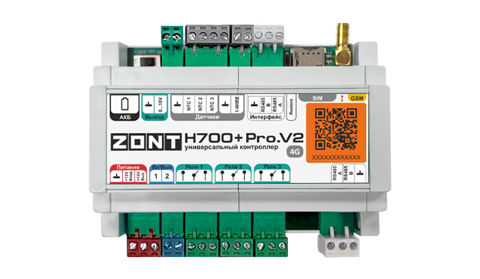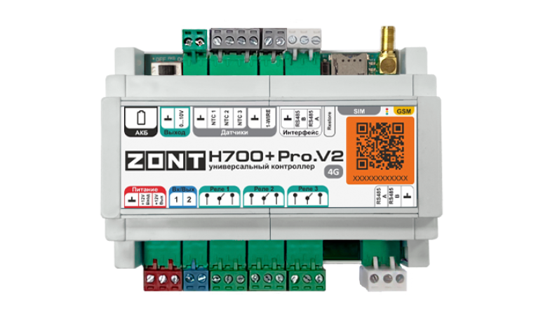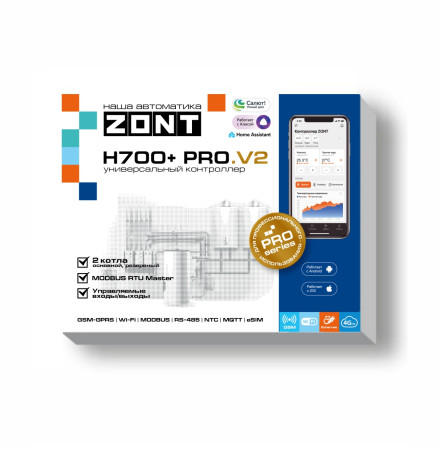 ZONT H700+ PRO.V2 — это обновленная версия универсального контроллера ZONT H700+ PRO для удаленного управления и автоматизации инженерных систем с поддержкой современных каналов связи (4G, Wi-Fi) и специальных протоколов Modbus RTU и MQTT, а также интеграцией в «Умный дом» (через Яндекс Алису, Сбер Салют, Home Assistant).